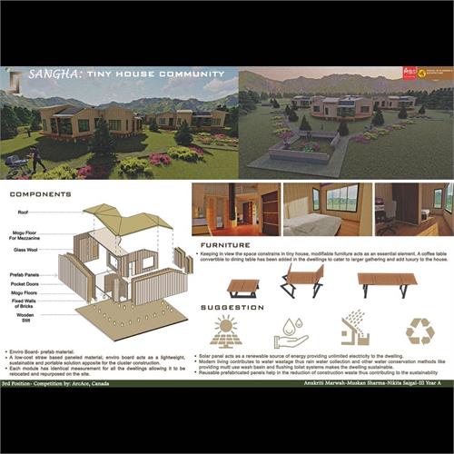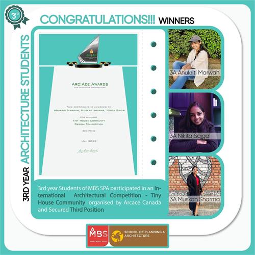 "Congratulations! MBS SPA students -Mehak Gupta, Swarnahiya Ganguly, Vishal Yadav and Ajun Naagal for winning Solar Decathlon India 2021-22 challenge in the “Community Resilience Shelter Division”. They were awarded in a glittering award ceremony held on 1st July 2022 at Taj ManSingh Hotel, New Delhi.